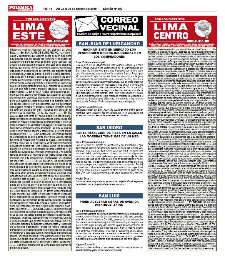 EDICION Nº 892. LIMA CENTRO, LIMA ESTE Y CORREO VECINAL