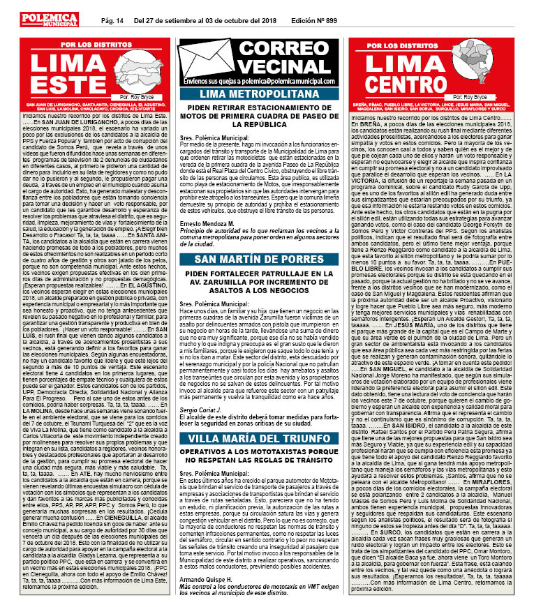 EDICION Nº 899. LIMA CENTRO, LIMA ESTE Y CORREO VECINAL