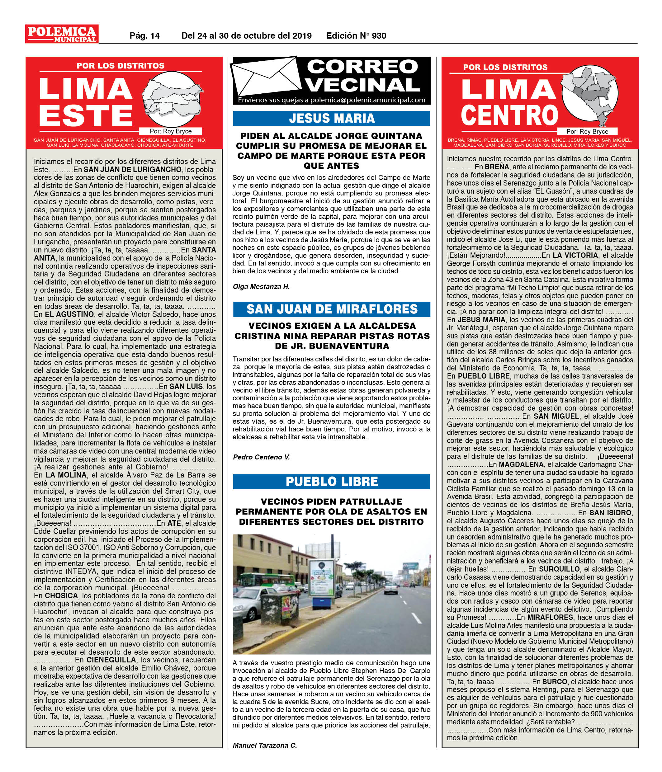 EDICION Nº 930. LIMA CENTRO, LIMA ESTE Y CORREO VECINAL