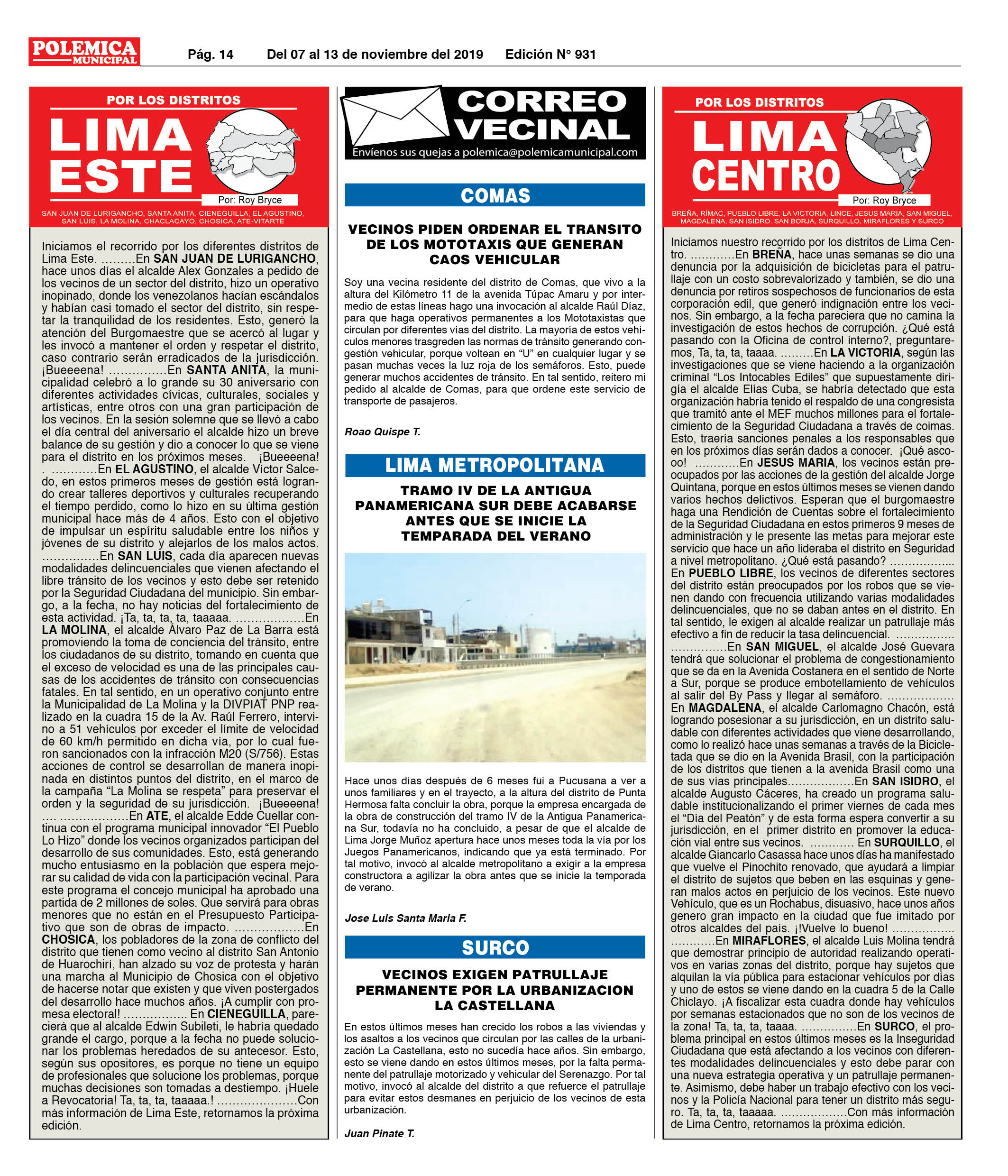 EDICION Nº 931. LIMA CENTRO, LIMA ESTE Y CORREO VECINAL