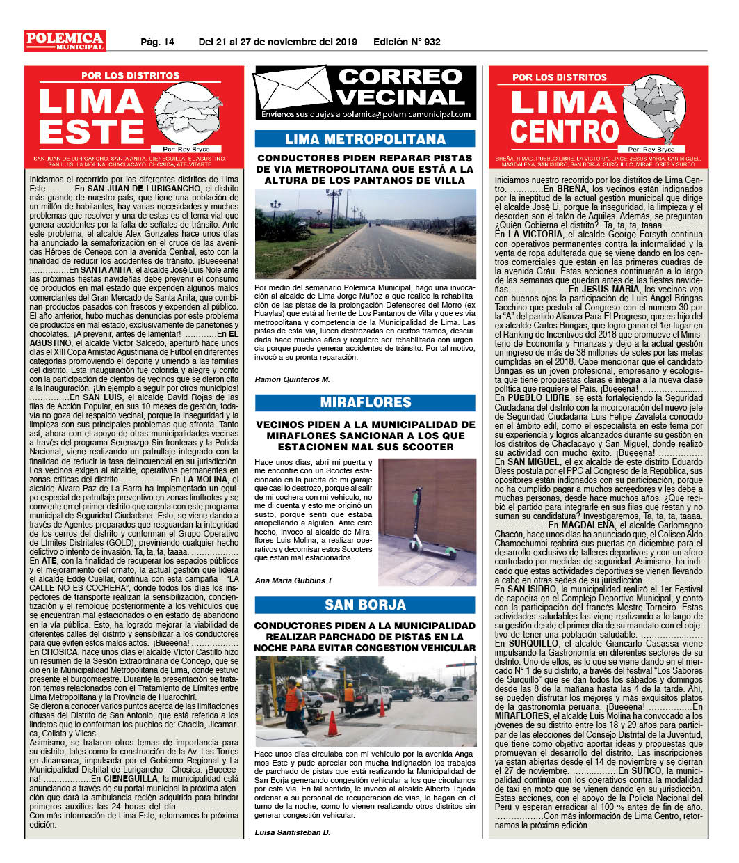 EDICION Nº 932. LIMA CENTRO, LIMA ESTE Y CORREO VECINAL