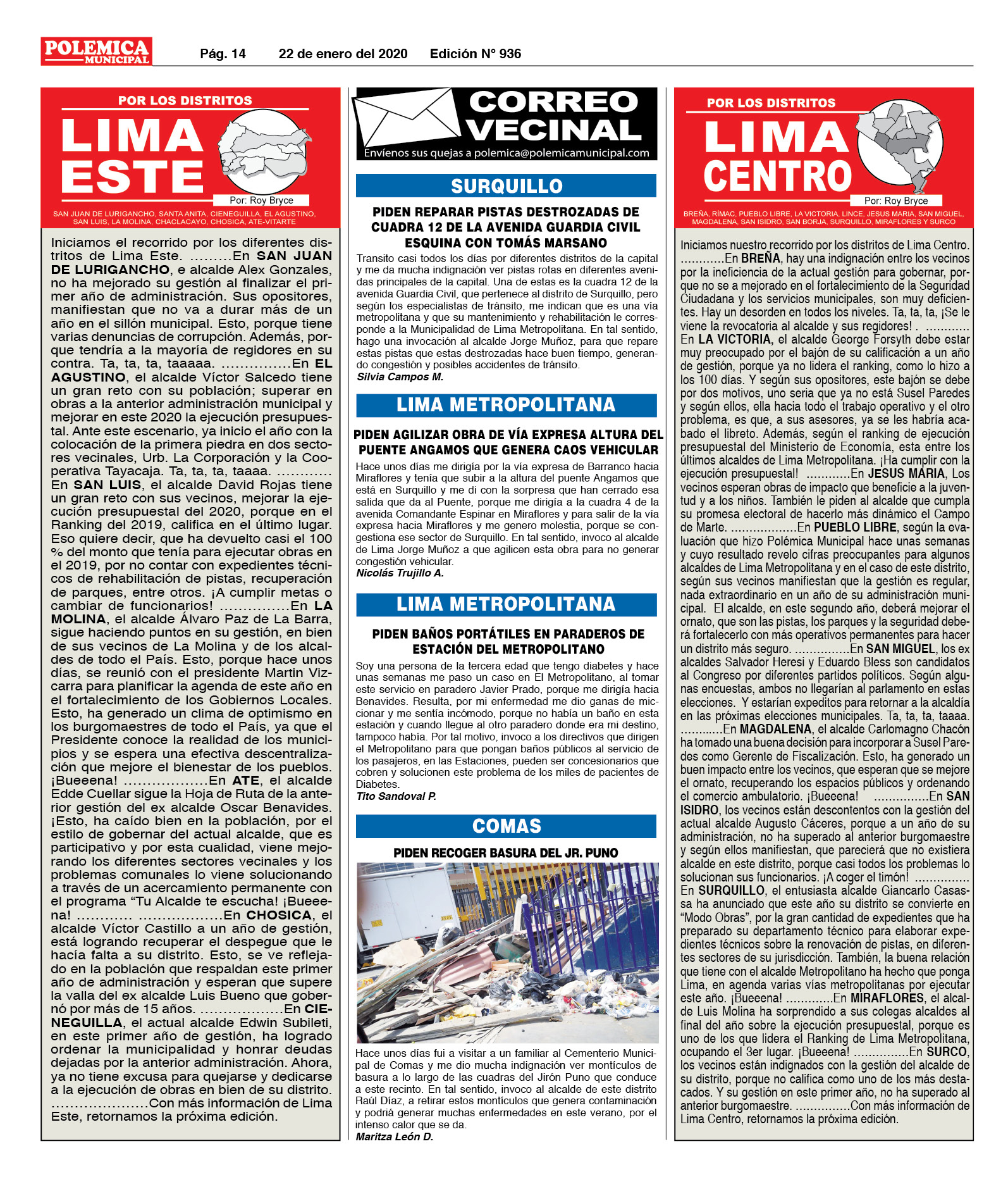 EDICION Nº 936. LIMA CENTRO, LIMA ESTE Y CORREO VECINAL