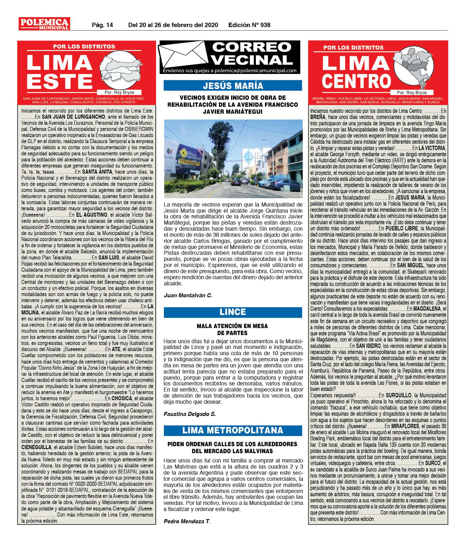 EDICION Nº 938. LIMA CENTRO, LIMA ESTE Y CORREO VECINAL