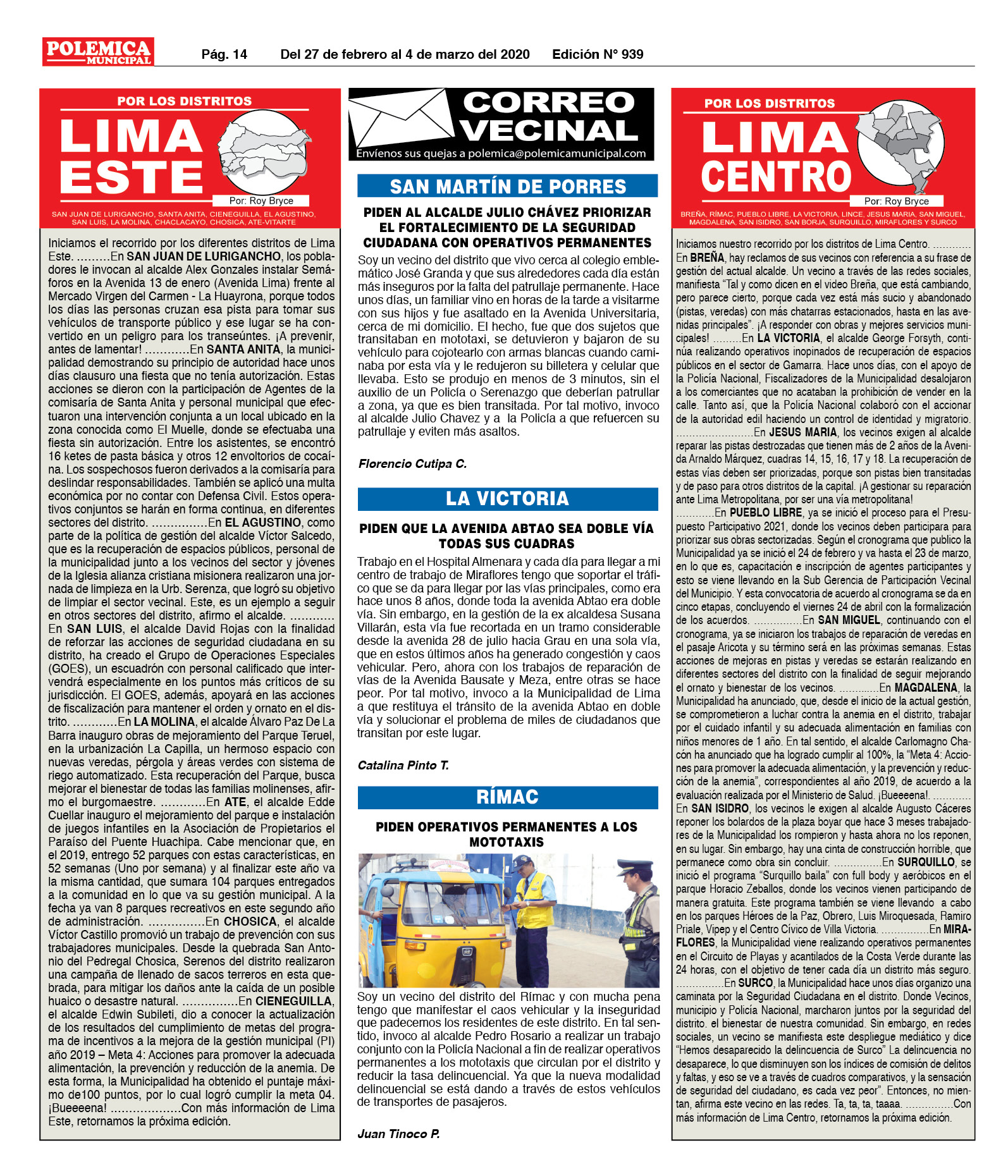 EDICION Nº 939. LIMA CENTRO, LIMA ESTE Y CORREO VECINAL