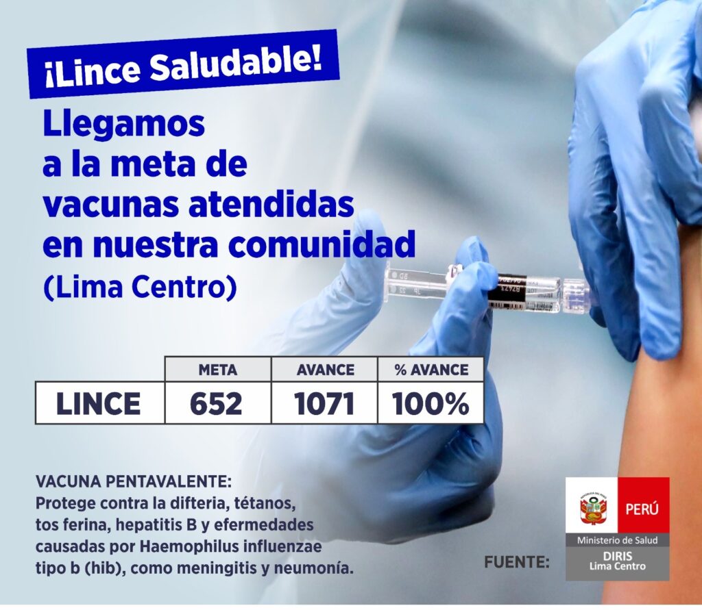 En el avance de vacunación que corresponde a Lima Centro, la Dirección de Redes Integradas de Salud (DIRIS) informó que el distrito de Lince, con respecto a su meta de vacunaciones, ha cumplido el 100 % de avance. Esto significa que los ciudadanos se encuentran con una cobertura de protección contra diversas enfermedades como la difteria, el tétano, la tos ferina, la hepatitis B y enfermedades causadas por Haemophilus influenzae tipo b (Hib), como la meningitis y la neumonía.