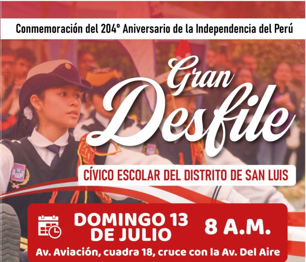 Después de más de 30 años, este domingo 13 de julio vuelve al distrito de San Luis, el Gran Desfile Cívico Escolar que se realizará en la Av. Aviación, anunció el alcalde Ricardo Perez. Será una gran fiesta de orgullo, tradición y peruanidad que no se pueden perder los vecinos.